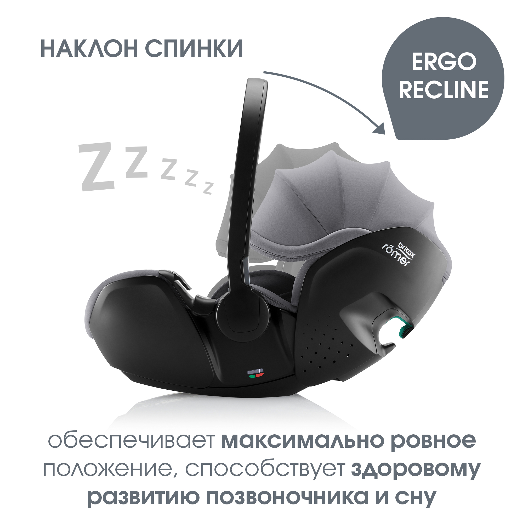 Технология Ergo Recline обеспечивает более ровное и эргономичное положение ребёнка, способствует здоровому развитию позвоночника и дыхания.