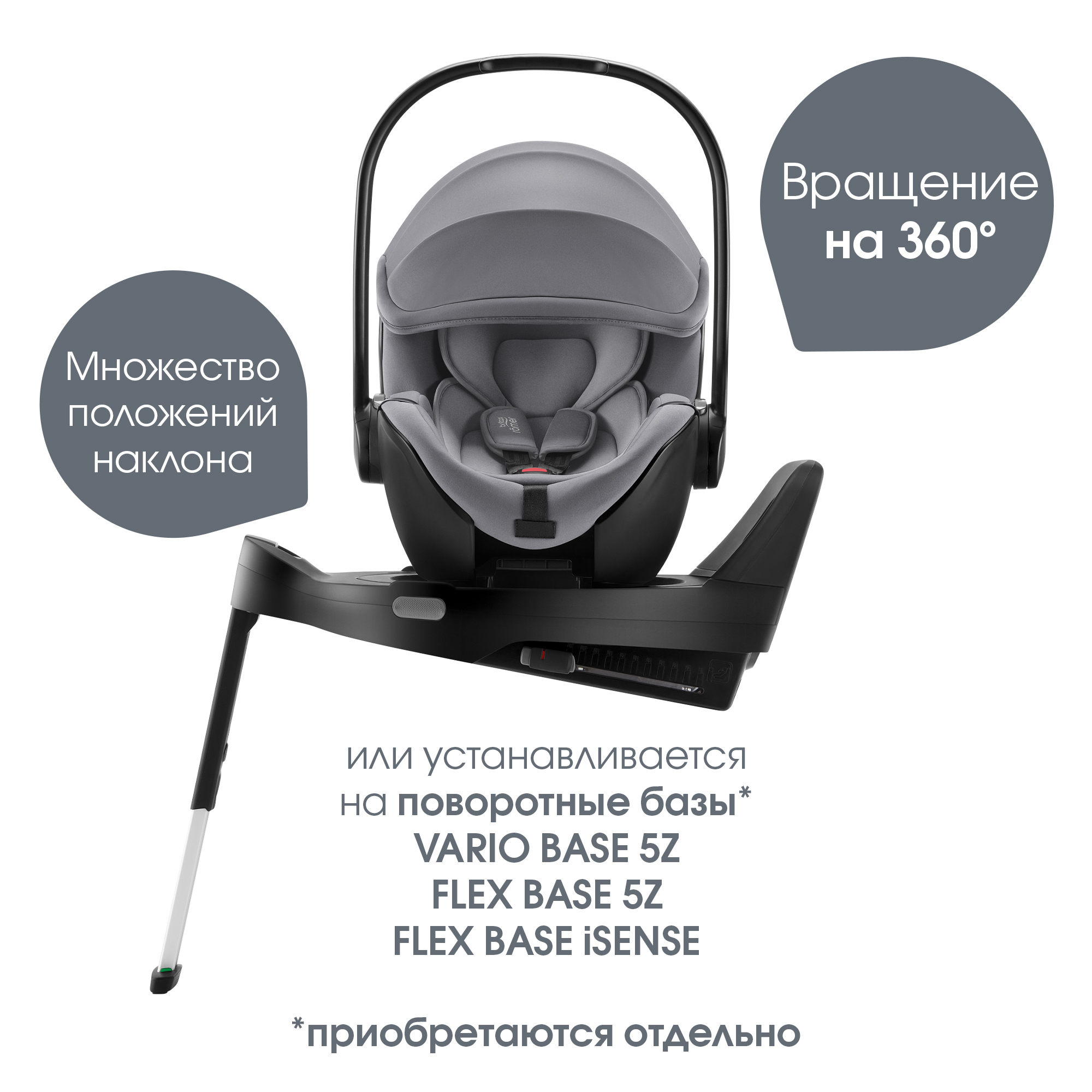 Устанавливается штатным ремнем или на поворотные базы Britax Roemer, а также совместима с большинством прогулочных колясок.